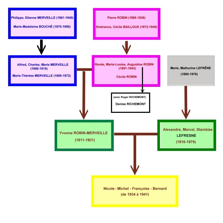 Ici, pas de généalogie compliquée. Cependant, pour s'y retrouver dans les Yvonne, Philippe, Alfred, Renée, etc..., voici le plan d'accès.